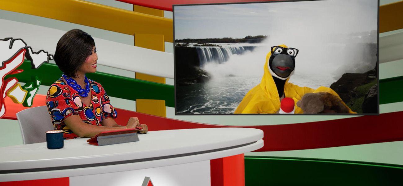 Aujourd'hui, la chef d'antenne Alice et son journaliste de terrain la marionnette Jean-Christopher Bernache nous font découvrir l'Ontario. C'est ici que l'on peut observer les célèbres chutes Niagara.