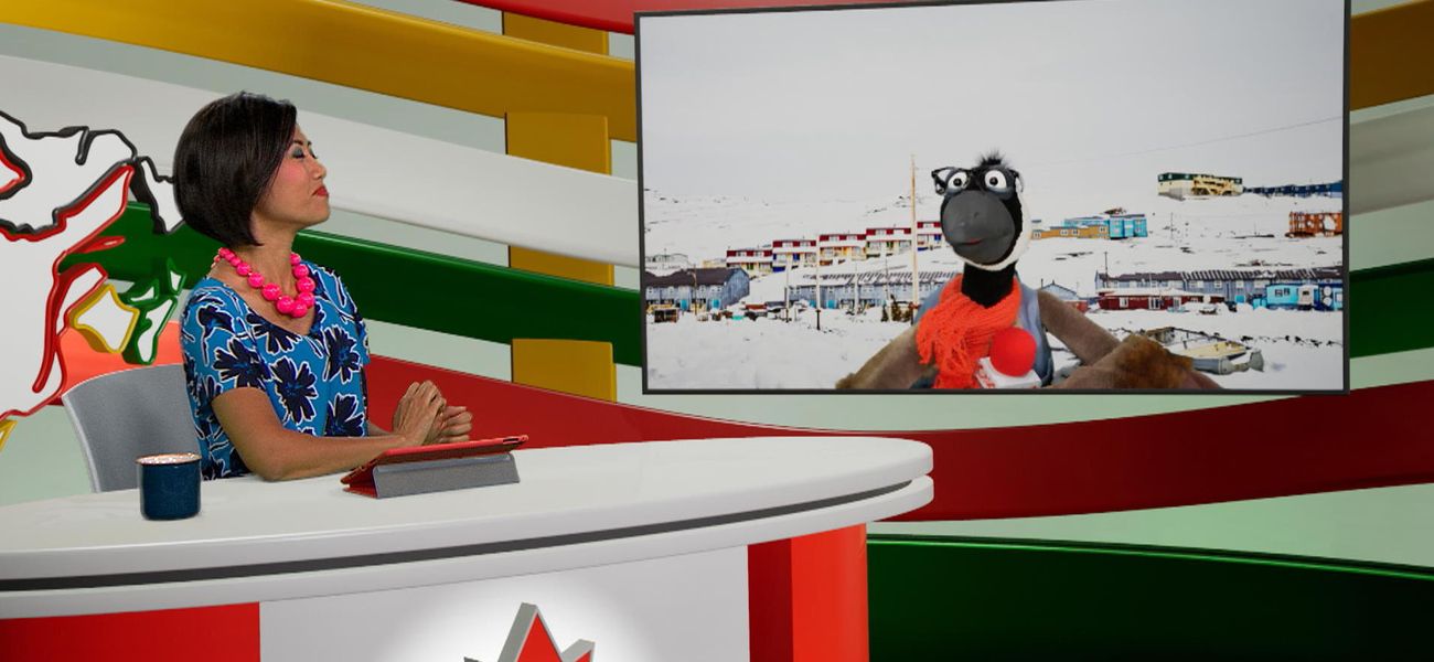 Aujourd'hui, la chef d'antenne Alice et son journaliste de terrain la marionnette Jean-Christopher Bernache nous donnent des détails fascinants sur le drapeau du Nunavut. Quel drapeau!