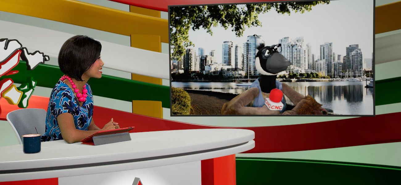 Aujourd'hui, la chef d'antenne Alice et son journaliste de terrain la marionnette Jean-Christopher Bernache nous donnent des détails fascinants sur le drapeau de la Colombie-Britannique. Quel drapeau!
