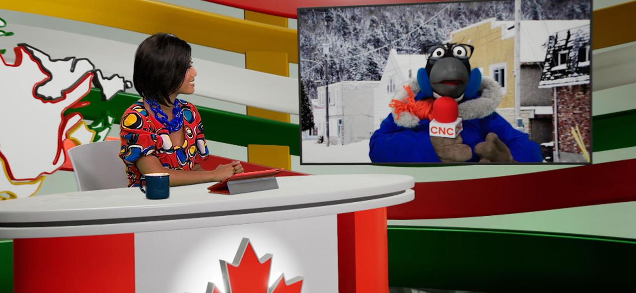 Aujourd'hui, la chef d'antenne Alice et son journaliste de terrain la marionnette Jean-Christopher Bernache nous présentent la plus grande barre Nanaïmo. Cette barre géante a été fabriquée en Ontario et pesait plus de 240 kilogrammes.