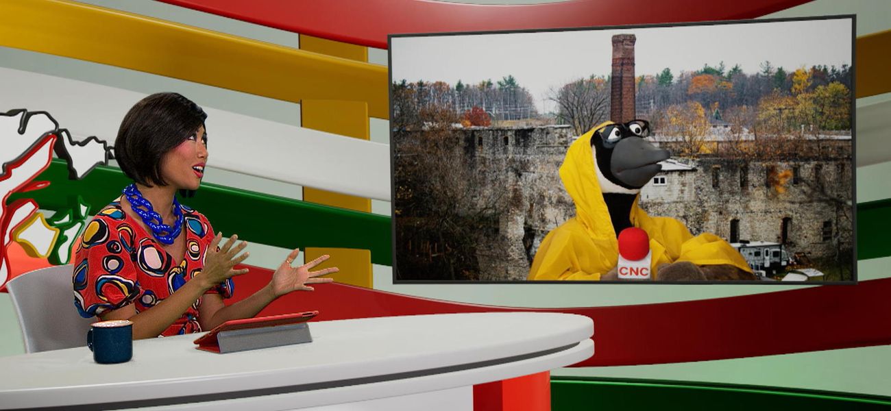 Aujourd'hui, la chef d'antenne Alice et son journaliste de terrain la marionnette Jean-Christopher Bernache nous présentent la pièce géante de deux dollars qui se trouve à Campbellford en Ontario. Cette sculpture imposante mesure 8 mètres de haut.