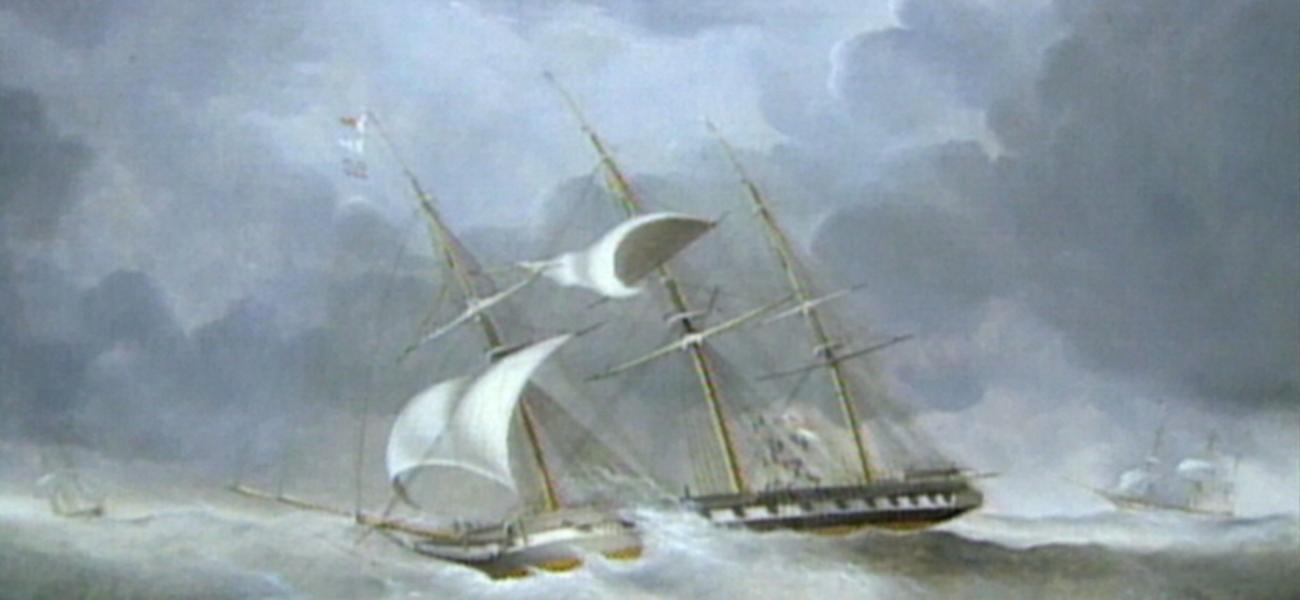 Les enfants analysent l'œuvre La frégate Warspite essuyant une bourrasque de John O'Brien, datant de 1856.