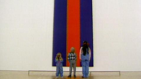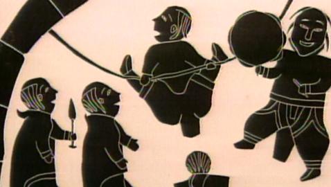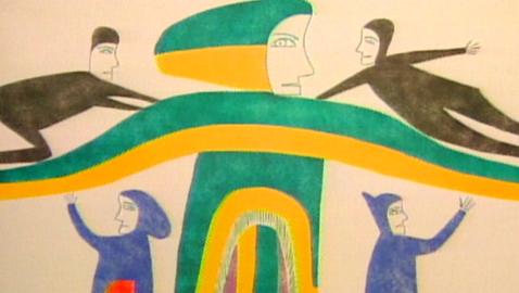 Les enfants analysent l'œuvre Chasseurs à la dérive de Joe Talirunili, datant de 1965.