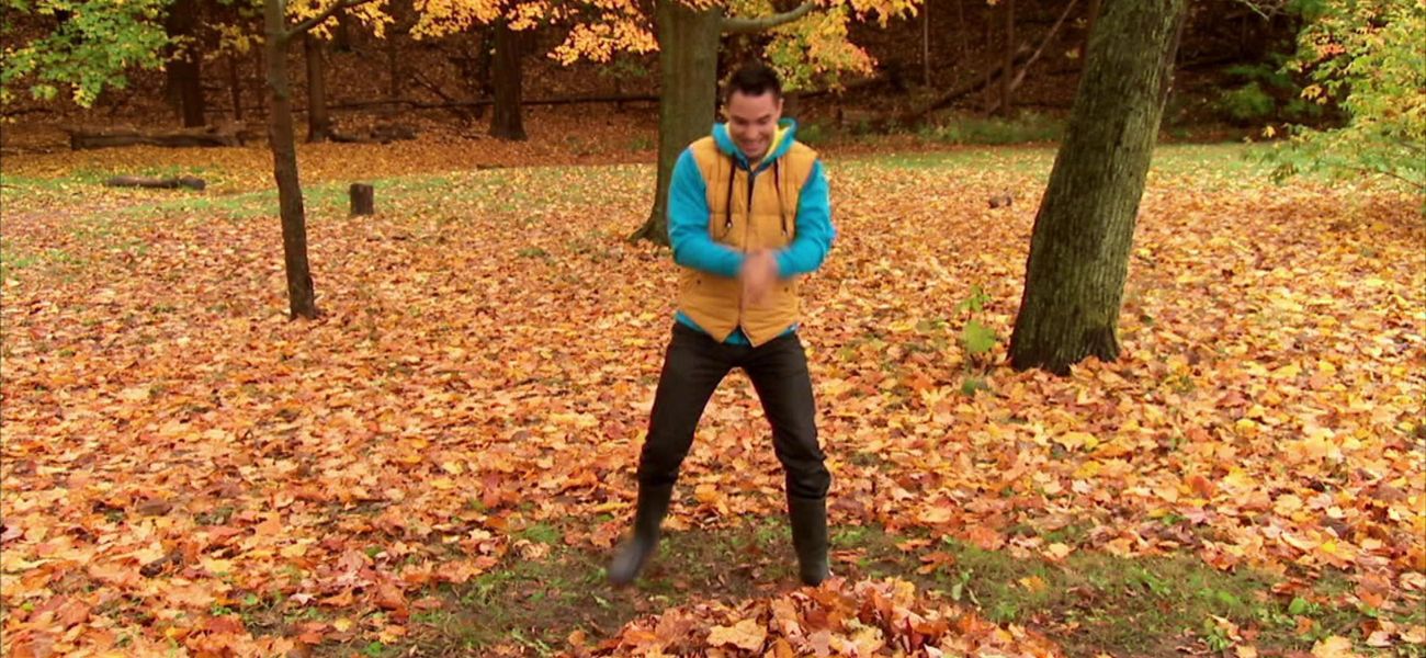 Josée and Louis introduce fall. Here, they play in the leaves.