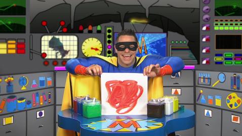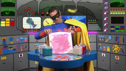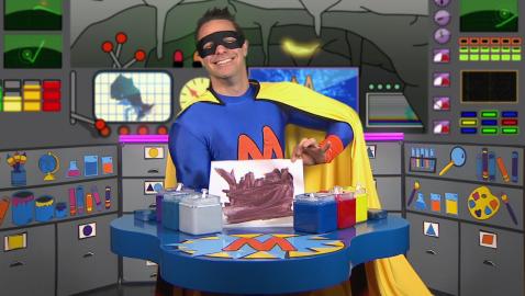 Super Mini mixes two colors to create a new one. Super Mini mixes blue and yellow to create green.