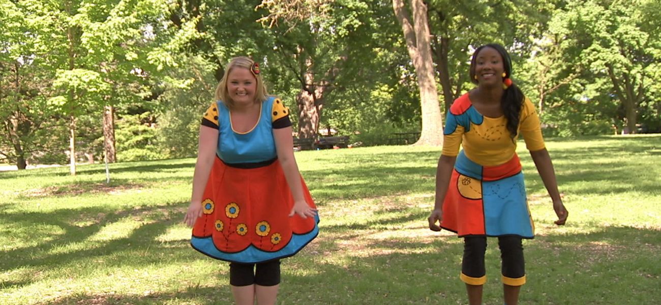 Lexie and Josée are having fun moving around in the park. They run, jump, and move quickly, slowly, with big movements and small movements. Lexie and Josée jump slowly and quickly.
