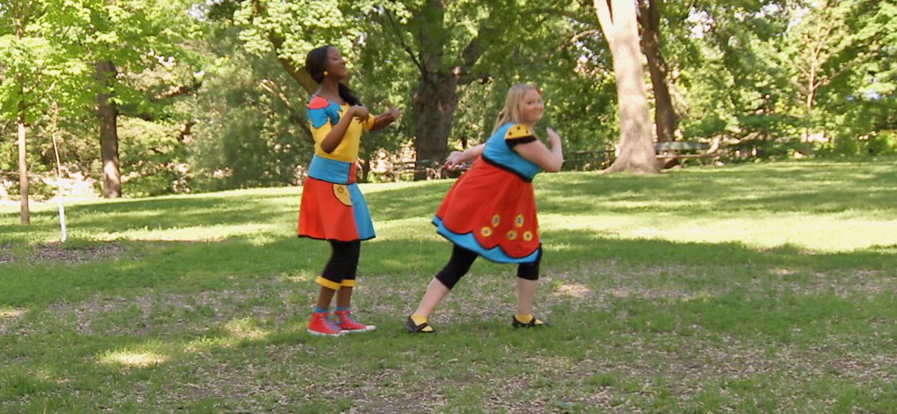 Lexie and Josée are having fun moving around in the park. They run, jump, and move quickly, slowly, with big movements and small movements. Lexie and Josée take big steps and small steps.