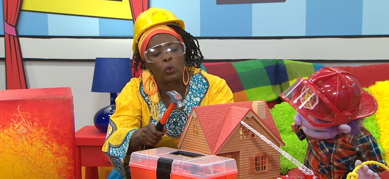 Madame Bonheur and Charlie dress up and play different professions. Charlie is dressed as a firefighter and Madame Bonheur as a carpenter.
