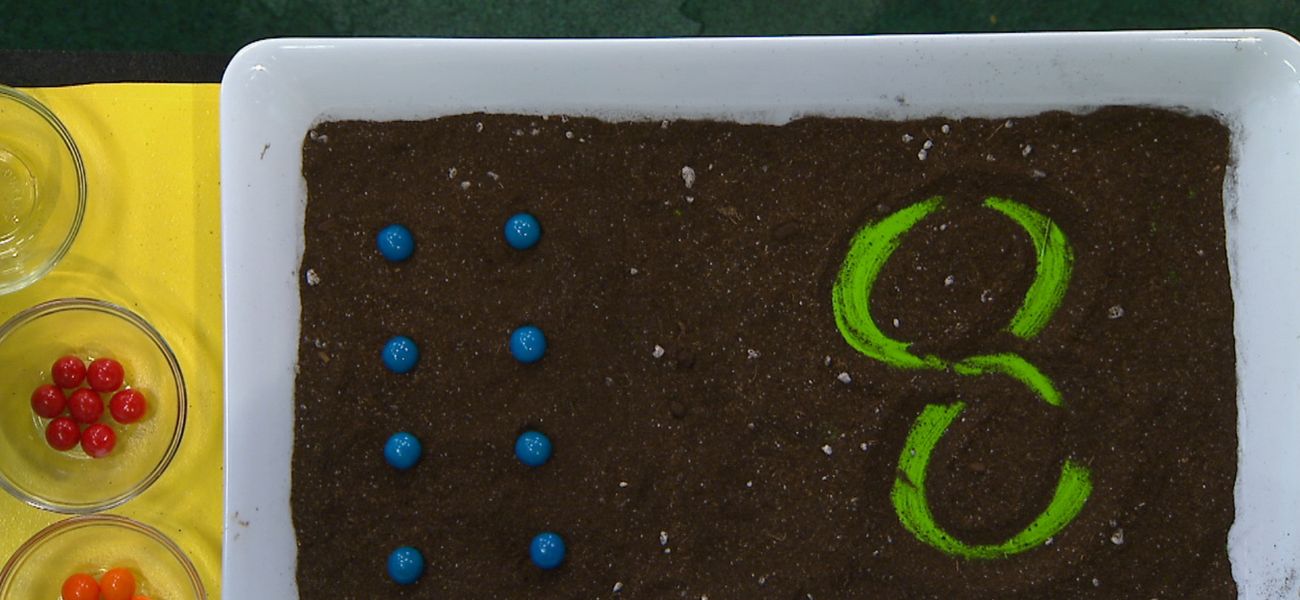 Help Fleurette and Terro count the seeds in their garden. Fleurette and Terro count eight blue seeds.