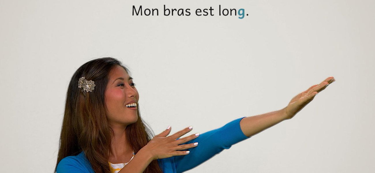 The featured adjective in this episode is: *long*. Christopher has a long arm and Alice a long leg. They realize that in French, the adjective 'long' is different in the masculine, in the feminine and in the plural form. One thing is sure, Alice has long hair.