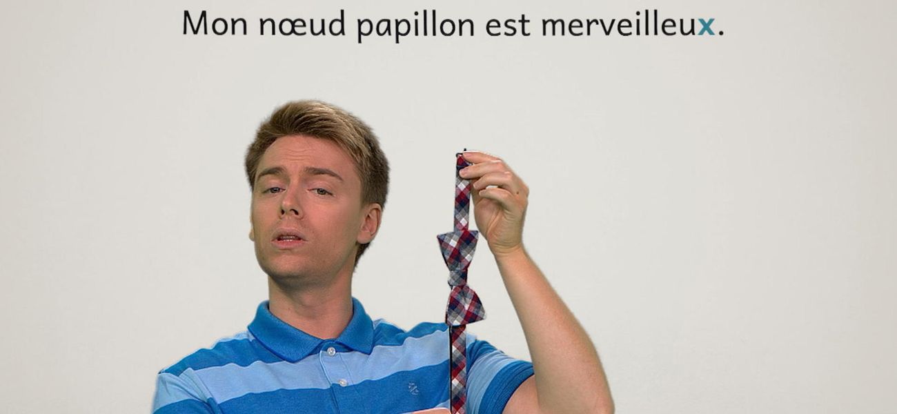 The featured adjective in this episode is: *merveilleux*. Christopher thinks his bow tie is wonderful. Alice thinks her hairdresser is wonderful.They realize that in French, the adjective 'merveilleux' is different in the masculine, in the feminine and plural form. One thing is sure, their styles are wonderful.