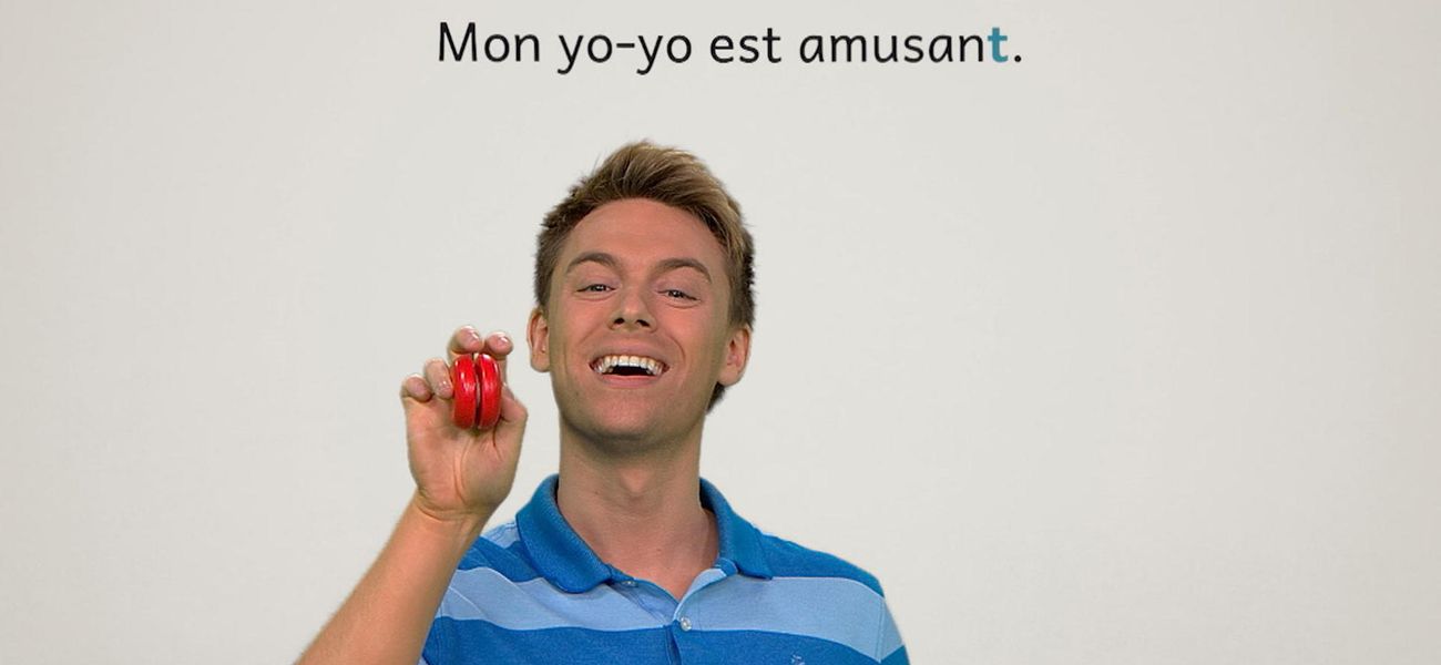 The featured adjective in this episode is: *amusant*. Christopher thinks his yo-yo is fun. Alice thinks her dance is fun. They realize that in French, the adjective 'amusant' is different in the masculine, in the feminine and plural form. One thing is for sure, both are fun.
