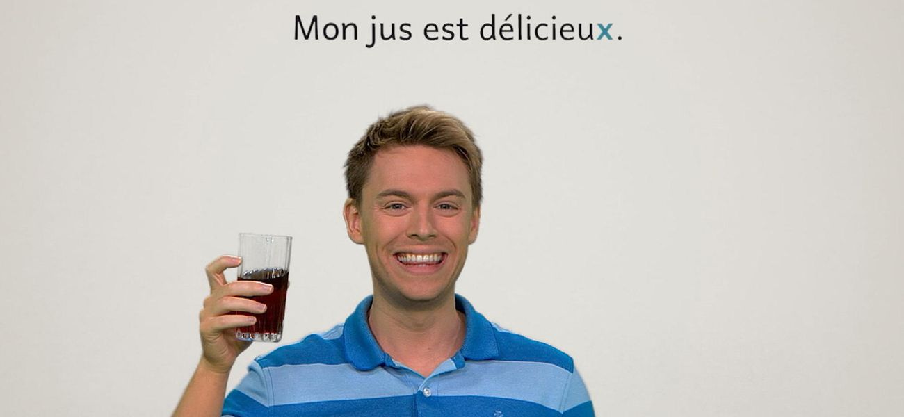 The featured adjective in this episode is: *délicieux*. Christopher finds his juice delicious. Alice finds her banana delicious. They realize that in French, the adjective 'délicieux' is different in the masculine, in the feminine and plural form. One thing is for sure, their food is delicious.