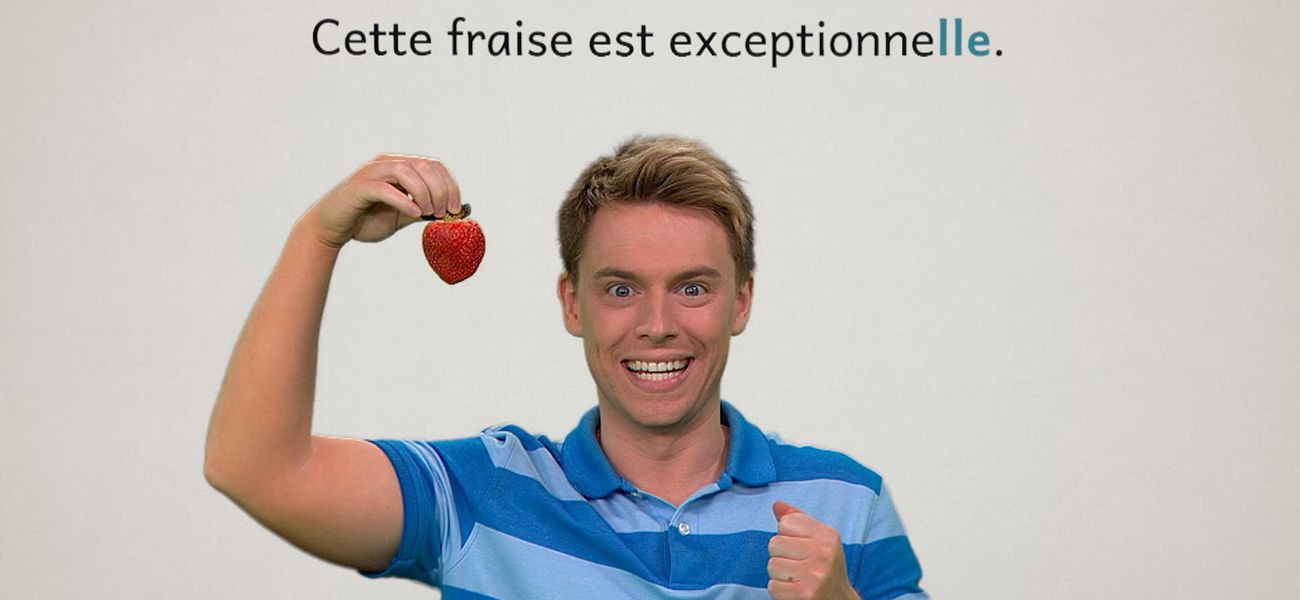 The featured adjective in this episode is: *exceptionnel*. Alice is enjoying an exceptional chocolate. Christopher is enjoying an exceptional strawberry. They realize that in French, the adjective 'exceptionnel' is different in the masculine, in the feminine and plural form. One thing is for sure, their food is exceptional.