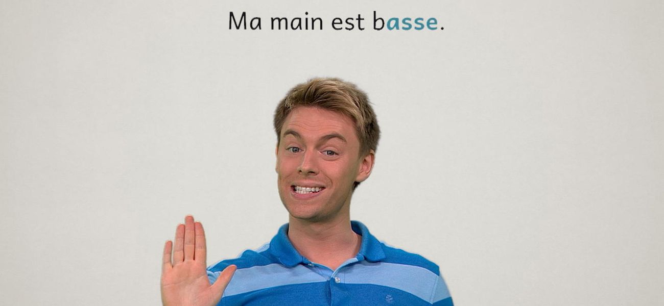 The featured adjective in this episode is: *bas*. Alice's finger is low. Christopher's hand is low. They realize that in French, the adjective 'bas' is different in the masculine, in the feminine and plural form. One thing is for sure, both are low.