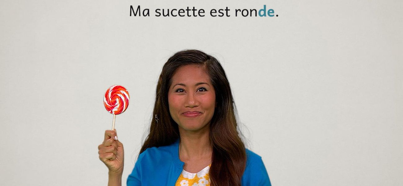 The featured adjective in this episode is: *rond*. Alice's button is round. Christopher's lollipop is round. They realize that in French, the adjective 'rond' is different in the masculine, in the feminine and plural form. One thing is for sure, both are round.