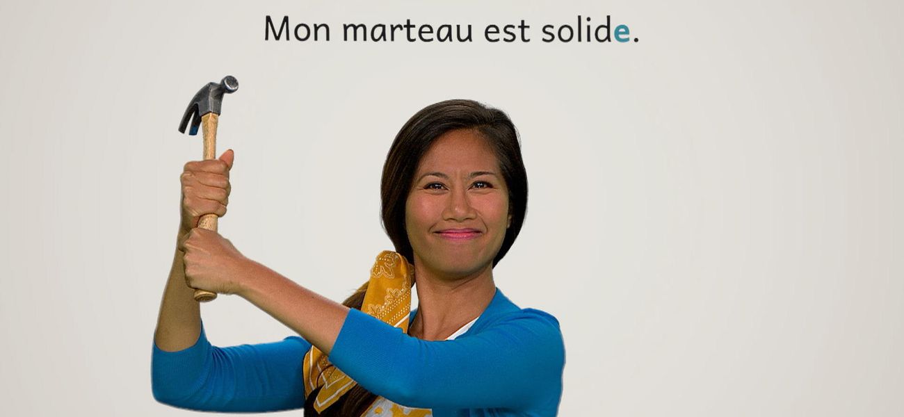 The featured adjective in this episode is: *solide*. Christopher holds a solid hammer and Alice has a solid ball; both are solid with an S. They realize that the adjective 'solide' takes the plural mark, but remains the same in the singular!