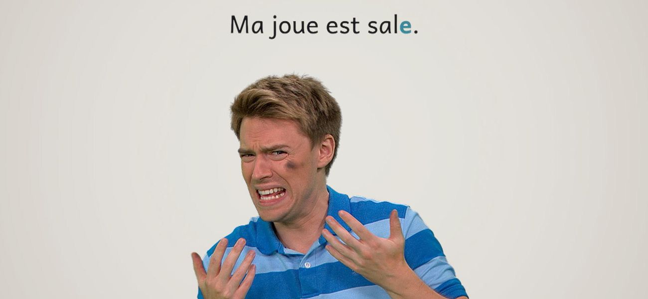 The featured adjective in this episode is: *sale*. Christopher has a dirty forehead. Alice has a dirty cheek. Their faces are dirty with an S. They realize that the adjective 'sale' takes the plural mark, but remains the same in the singular!