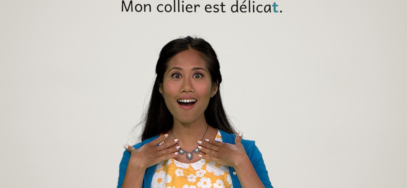The featured adjective in this episode is: *délicat*. Christopher's necklace is delicate. Alice's feather is delicate.They realize that in French, the adjective 'délicat' is different in the masculine, in the feminine and plural form. One thing is for sure, their objects are delicate.