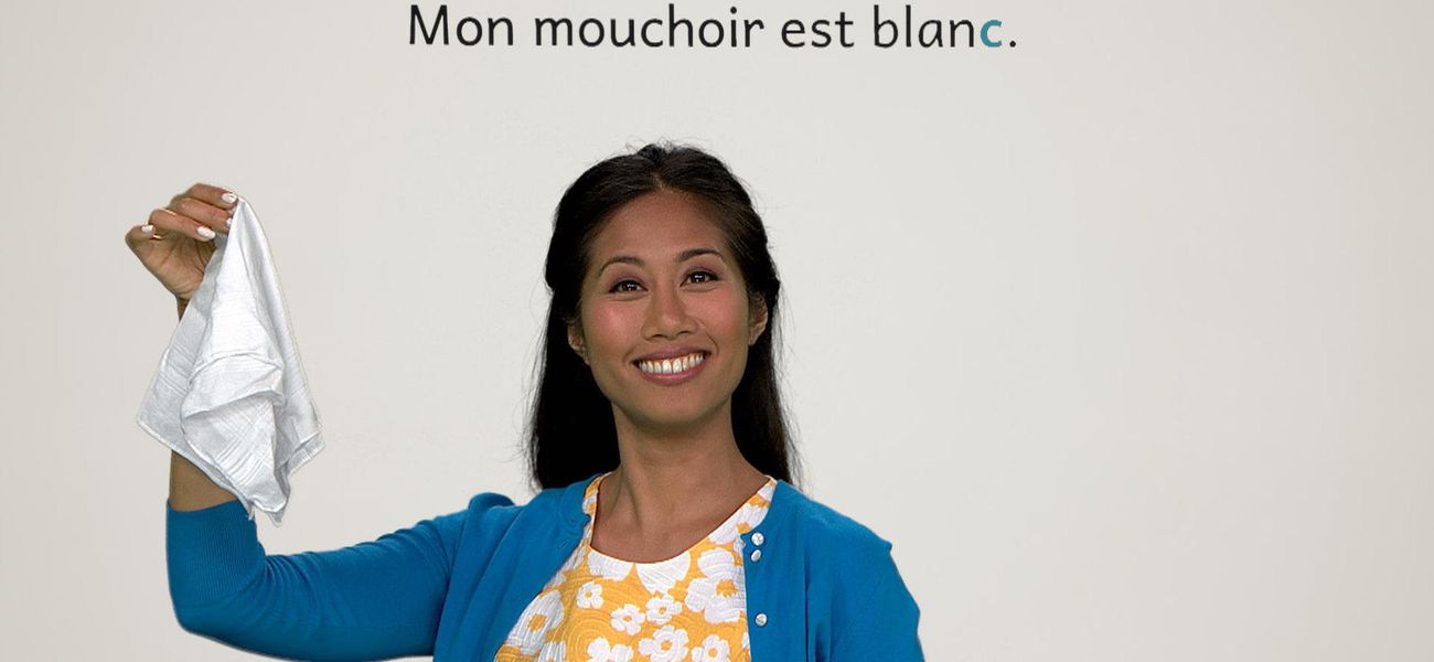 The featured adjective in this episode is: *blanc*. Alice's handkerchief is white. Christopher's marshmallow is white. They realize that in French, the adjective 'blanc' is different in the masculine, in the feminine and plural form. One thing is for sure, their objects are white