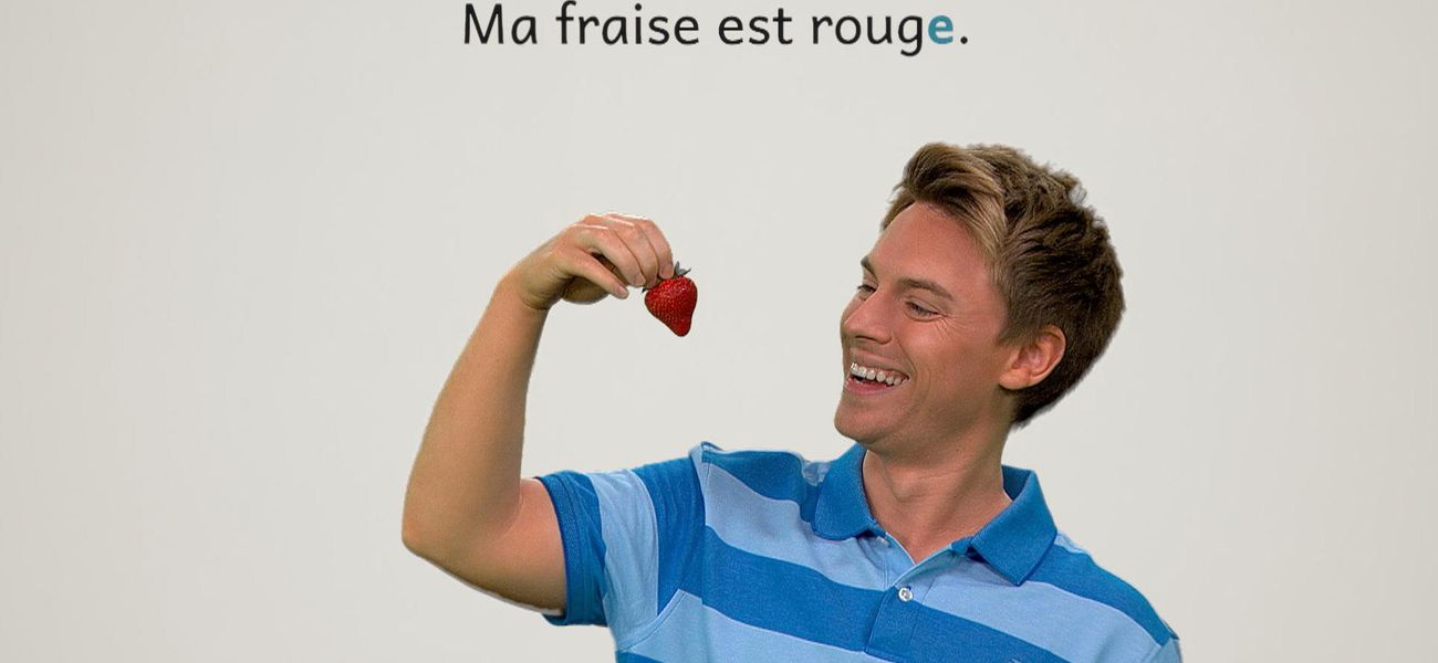 The featured adjective in this episode is: *rouge*. Alice's pencil is red and Christopher's strawberry is red. Their objects are red with an S. They realize that the adjective 'rouge' takes the plural mark, but remains the same in the singular!