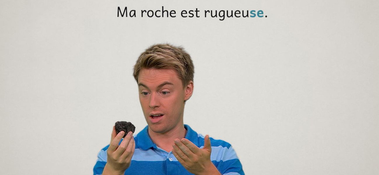 The featured adjective in this episode is: *rugueux*. Christopher's stick is rough. Alice's rock is rough. They realize that in French, the adjective 'rugueux' is different in the masculine, in the feminine and plural form. One thing is for sure, their objects are rough.