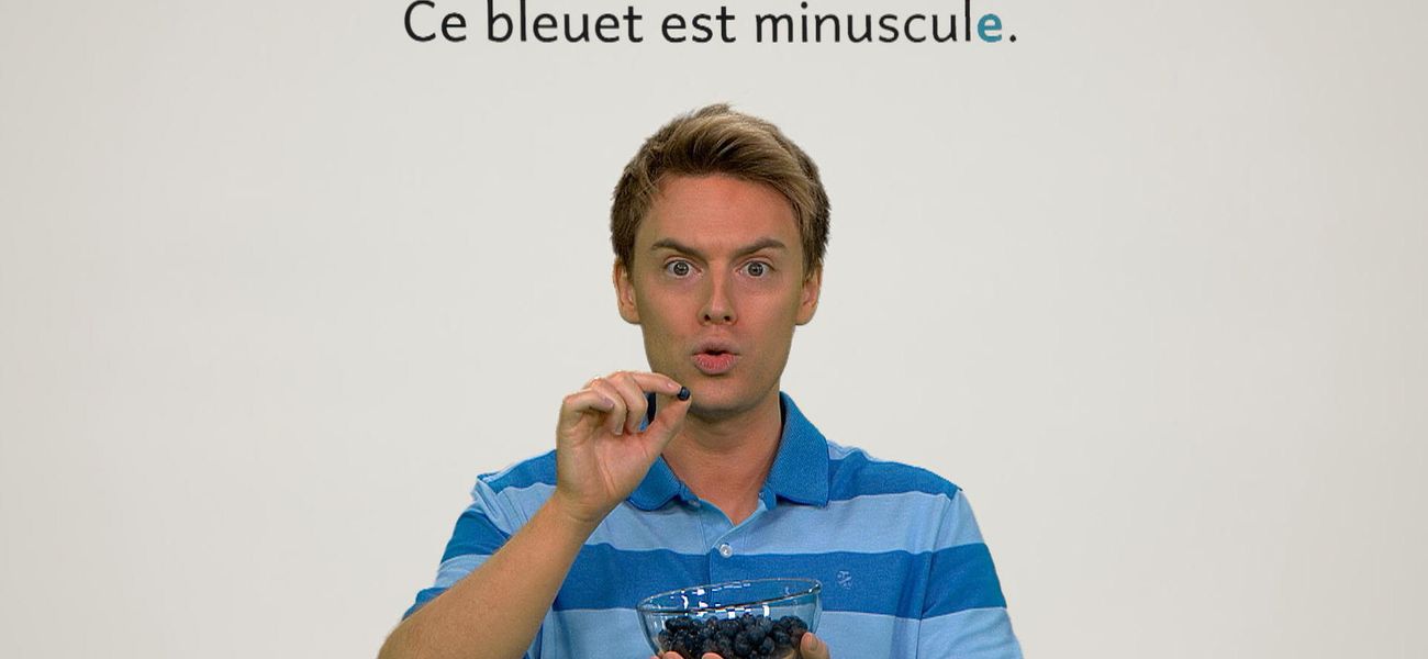 The featured adjective in this episode is: *minuscule*. Christopher's blueberry is tiny and Alice's figurine is tiny. Both are tiny with an S. They realize that the adjective 'minuscule' takes the plural mark, but remains the same in the singular!