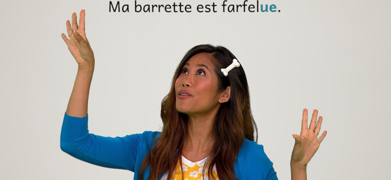 The featured adjective in this episode is: *farfelu*. Christopher's boa is wacky. Alice's hair clip is wacky. They realize that in French, the adjective 'farfelu' is different in the masculine, in the feminine and plural form. One thing is for sure, their accessories are wacky.