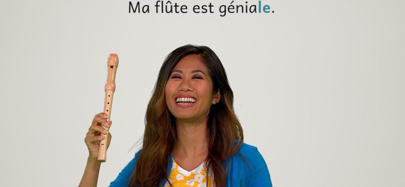 The featured adjective in this episode is: *génial*. Christopher's ukulele is great. Alice's flute is great. They realize that in French, the adjective 'génial' is different in the masculine, in the feminine and plural form. One thing is for sure, their instruments are awesome.