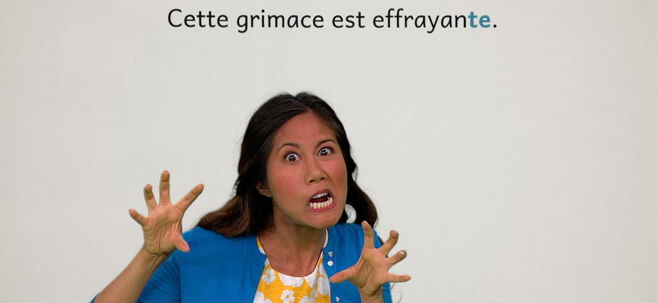 The featured adjective in this episode is: *effrayant*. Christopher finds the noise frightening. Alice makes a scary face. They realize that in French, the adjective 'effrayant' is different in the masculine, in the feminine and plural form. One thing is for sure, both are scary.