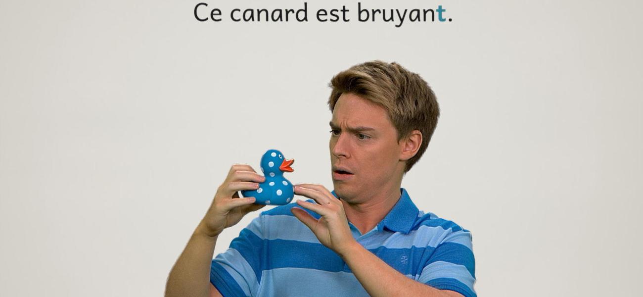 The featured adjective in this episode is: *bruyant*. Christopher's duck toy is noisy. Alice's flute is noisy too. They realize that in French, the adjective 'bruyant' is different in the masculine, in the feminine and plural form. One thing is for sure, both are noisy.