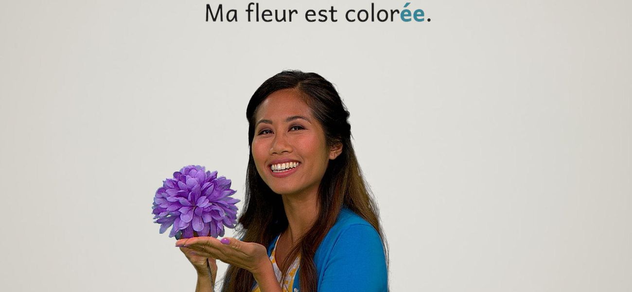 The featured adjective in this episode is: *coloré*. Alice's disc is colorful. Christopher's flower is colorful. They realize that in French, the adjective 'coloré' is different in the masculine, in the feminine and plural form. One thing is for sure, both are colorful.