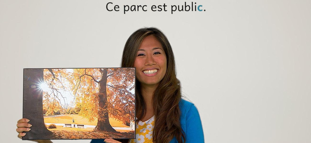The featured adjective in this episode is: *public* The park in the photo held by Alice is public. The photo on Christopher's phone is public. They realize that in French, the adjective 'public' is different in the masculine, in the feminine and plural form. One thing is for sure, both are public.