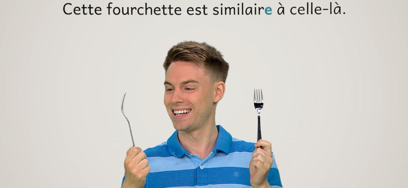 The featured adjective in this episode is: *similaire*. Alice's knife is similar to this one. Christopher's fork is similar to this one. Their utensils are similar with an S. They realize that the adjective 'similaire' takes the plural mark, but remains the same in the singular!