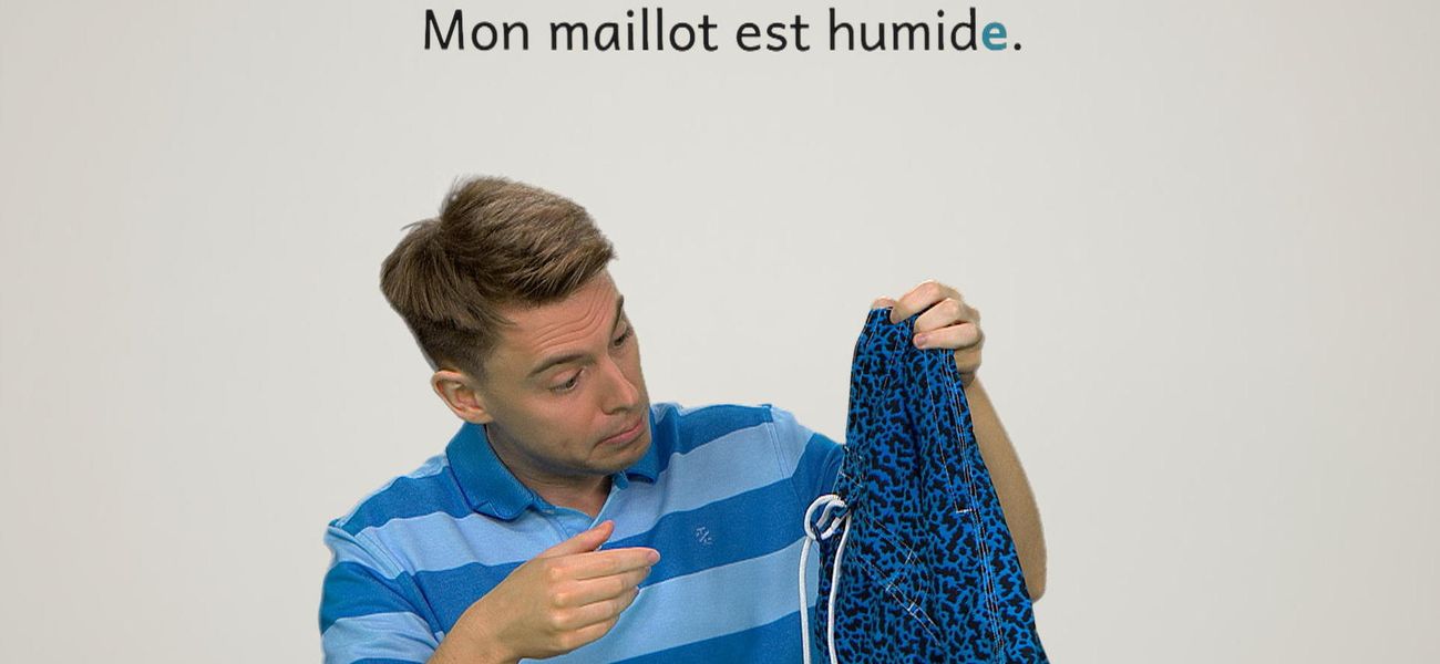 The featured adjective in this episode is: *humide*. Alice's bathing suit is moist. Christopher's towel is moist. Their items are moist with an S. They realize that the adjective 'humide' takes the plural mark, but remains the same in the singular!