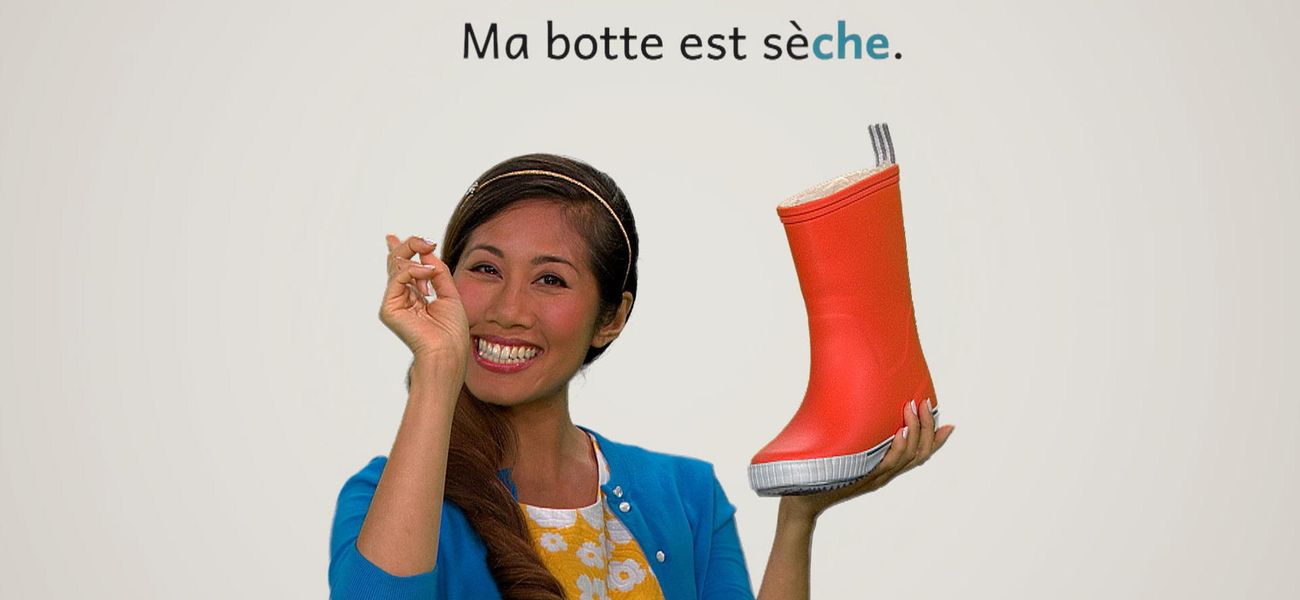 The featured adjective in this episode is: *sec*. Alice's umbrella is dry. Christopher's boot is dry. They realize that in French, the adjective 'sec' is different in the masculine, in the feminine and plural form. One thing is for sure, their objects are dry.