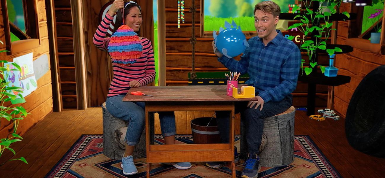 Resourceful Alice and creative Christopher use balloons for their creations: Alice makes a piñata and Christopher makes a dinosaur. Wow, you can really make a lot of different things out of the same object!
