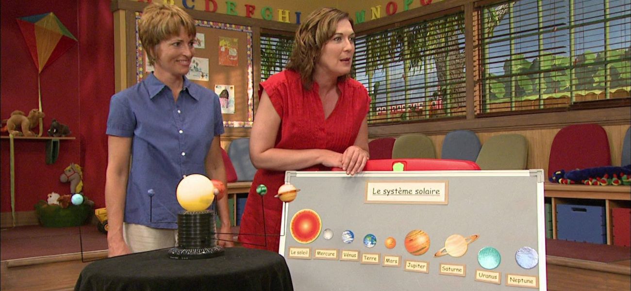 In this episode, Carmen asks Pomme-Pomme to guess a rocket. The children meet an astronomer who brings a model of the solar system that shows the children all the planets. The children sing “The Moon and Stars” with Carmen and do various activities. At the end, Carmen reads the story “Le petit pommier” to the children to develop awareness of the phoneme “oi”.