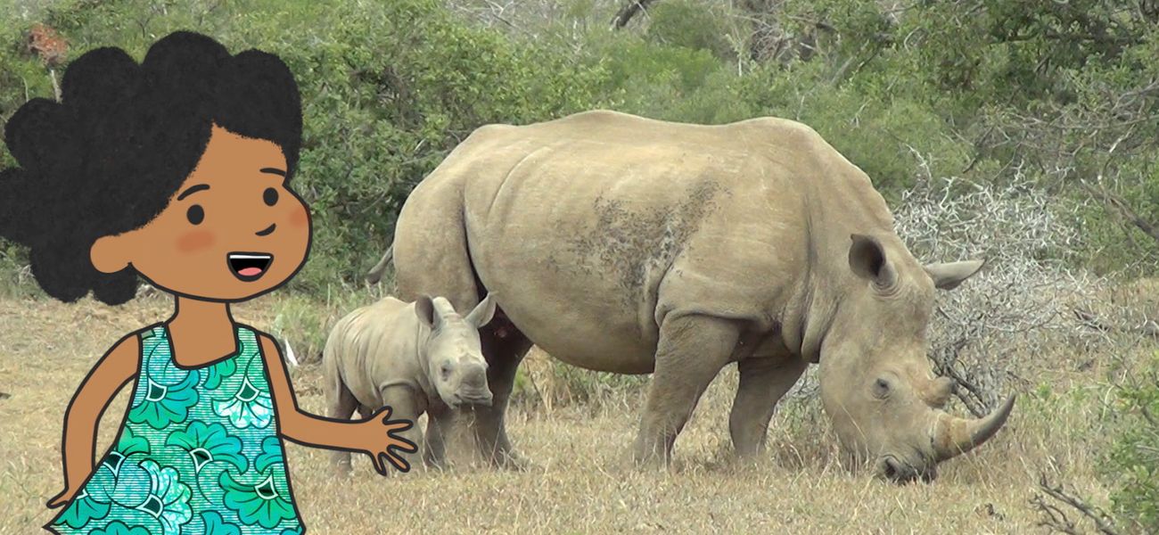Hello rhino! You are a huge, heavy, grey-skinned animal... But above all, you have big horns on your snout! You live in scrub forests and savannahs. Always near a watering place because you need to drink every day and cover yourself with mud! Yes, your skin may be thick, but it is fragile and by covering yourself with mud, you protect it from the sun!