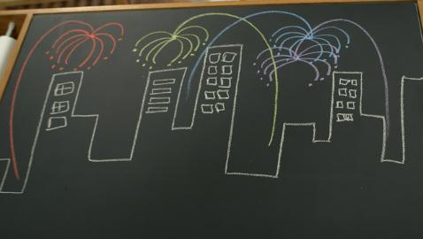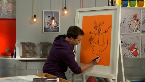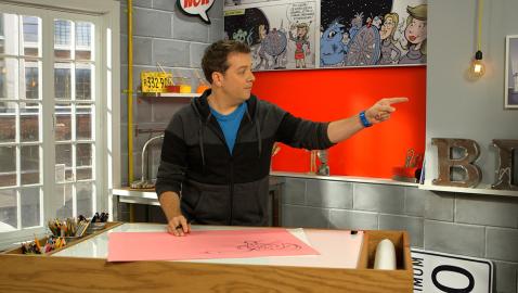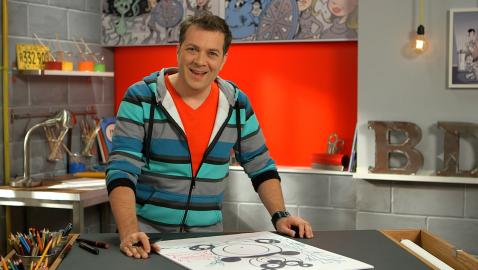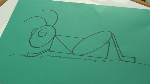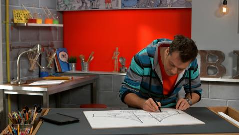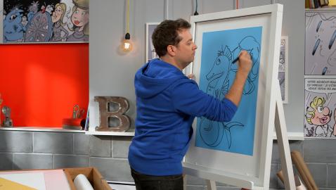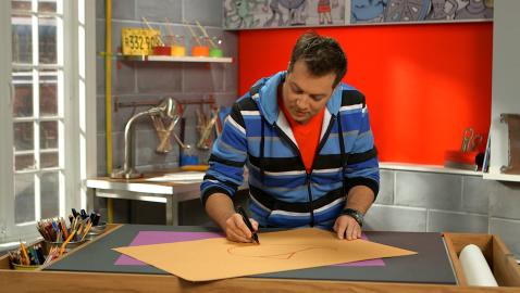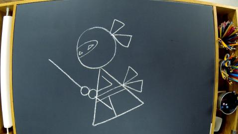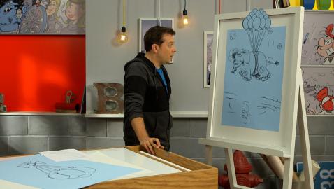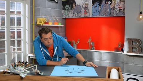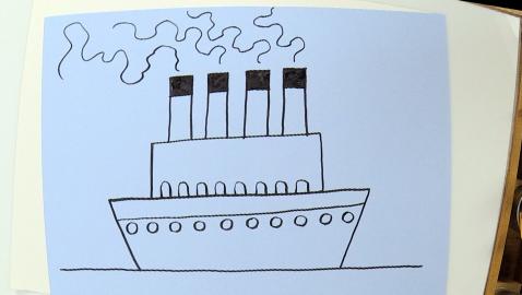 How to draw a sail board? Tristan uses the shapes of a wave and a sun to draw a parasol and a sailboat.