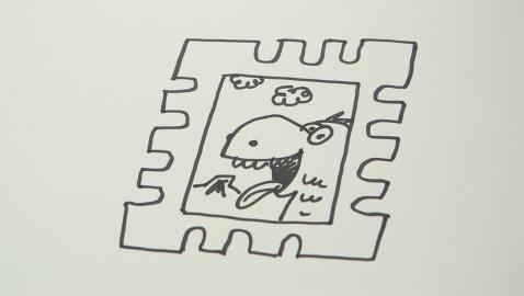 Tristan uses the letter 'u' and geometric shapes to draw a postage stamp.