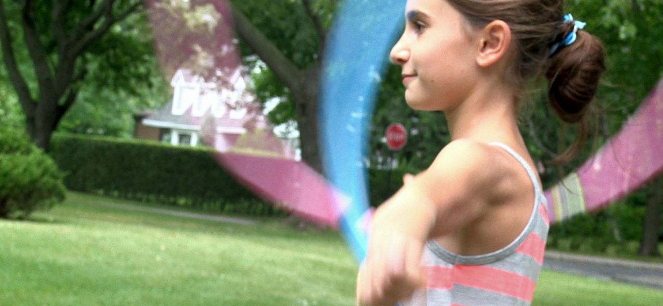 Claudia explains the techniques to make five hoops spin at the same time. She plays it every day, she likes to do it with music.