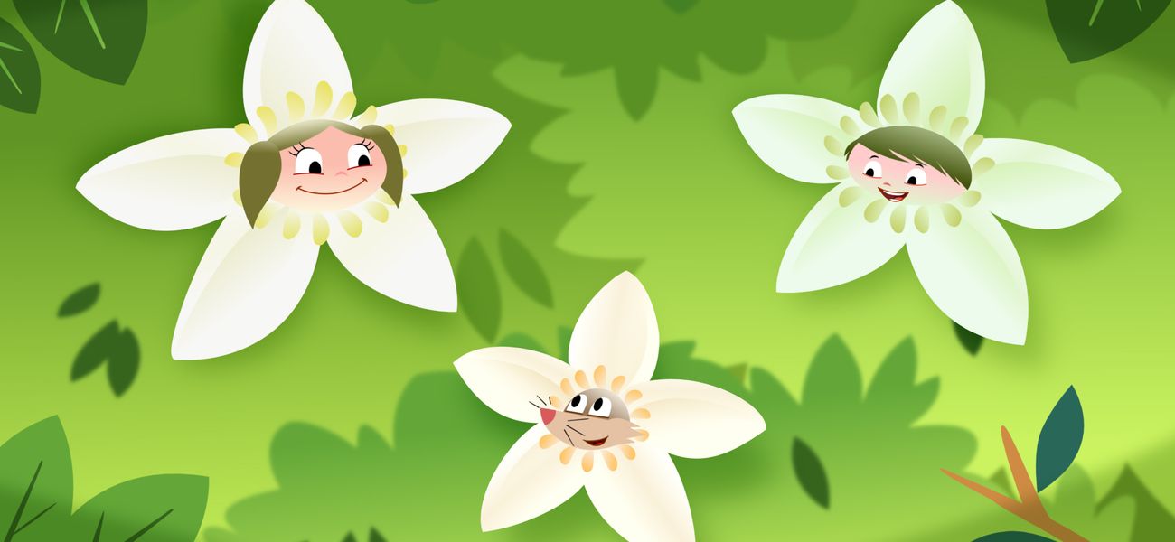 Having found some orange blossoms, our friends learn that oranges come from orange blossoms. How does a flower become a fruit? They'll find out once they've turned into flowers.