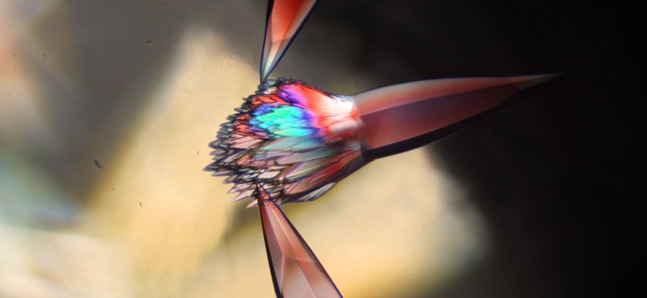 You see these little crystals, that take beautiful colors when illuminated with a special light? They are tiny and they are made from ... egg. The study of crystals allows researchers to develop new medicines.