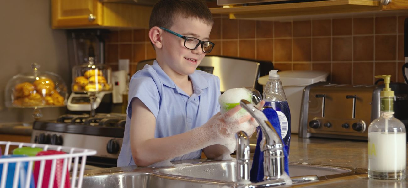 Zachary has just finished lunch and is ready to wash his dishes. He is careful not to waste too much. He doesn't use too much water and soap. He pours a little bit of warm water and with the help of a sponge, he rubs his bowl, his glass and his utensils. He has so much fun washing the dishes, but he also makes sure to dry them well and put them back in their place. And you? Are you ready?