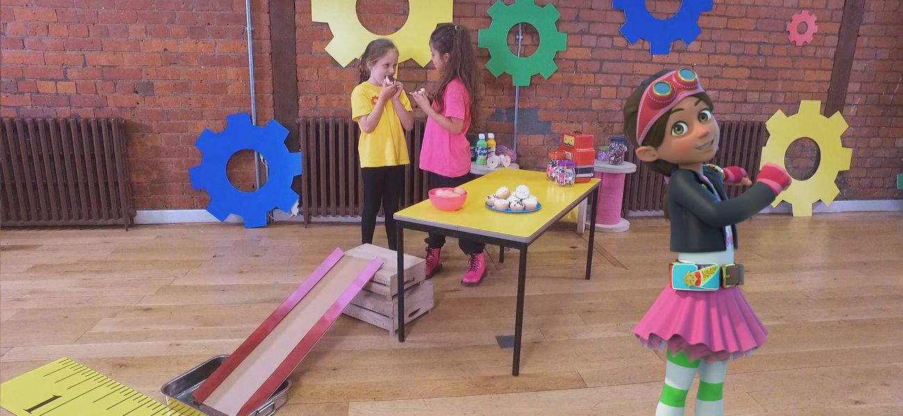 Bitz and Bob remember one of their adventures where they had to help their friend the Big Pop. He was afraid to climb down a building and they had to build a long, gradual slide to help him get off safely and slowly. In a studio, children try to recreate the same experience by rolling eggs without breaking them, hence the importance of making a spiral slide.