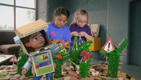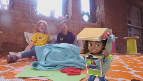 Bitz and Bob remember one of their adventures where they had to build an ultra-resistant house to protect the three pigs from the big bad wolf-robot. In a studio, children try the same using materials around them. They note that bricks are a good choice for building a strong and resistant house.