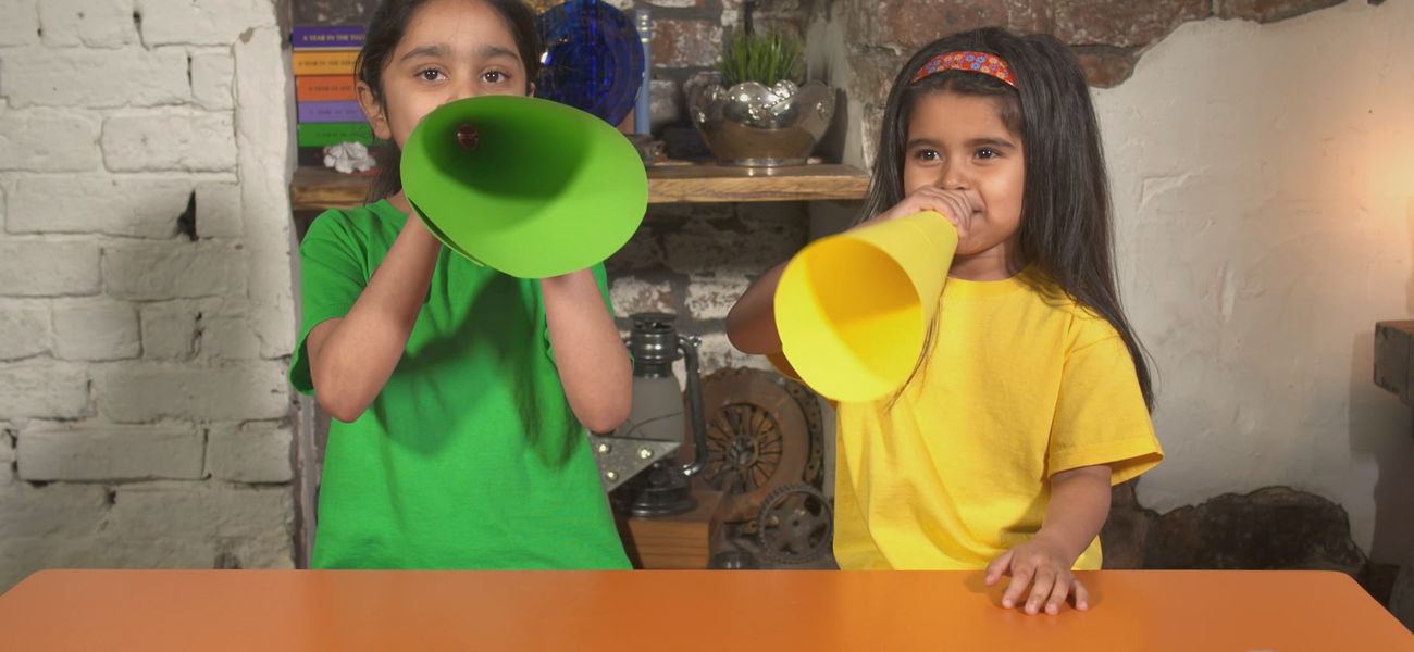 Bitz and Bob remember one of their adventures where they had to find a trick to amplify Biseau's broken voice during a concert. In a studio, children build a megaphone to amplify a music piece. They realize that the shape of the megaphone is very important so that the sound reaches everyone's ears better.
