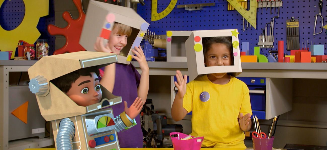 Bitz and Bob remember one of their adventures where they lost Robot Bob's helmet and tried to make another one. In a studio, children are trying to build a 3D robot helmet.