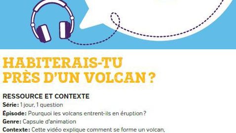 À l’intention des enseignants de français langue seconde, cette fiche pédagogique « Habiterais-tu près d'un volcan? » accompagne la vidéo « Pourquoi les volcans entrent-ils en éruption? » de la série « 1 jour, 1 question ».